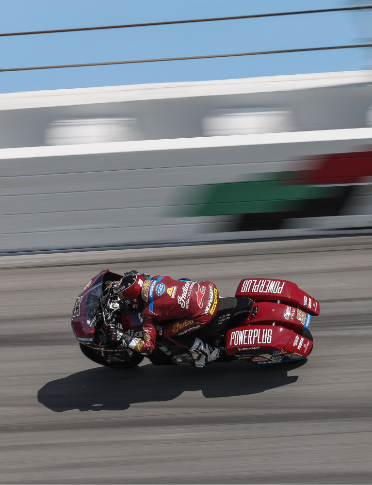 Em 1909, vencemos a primeira corrida de motociclos alguma vez realizada no Indianapolis Motor Speedway. Em 1937, Ed Kretz conquistou a primeira prova Daytona 200 numa Indian Sport Scout. O grupo original Wrecking Crew dominou o panorama das corridas no pós-guerra. Mantivemos essa tradição na modalidade Flat Tracking Racing ao longo da década de 2010. Os pilotos de hoje fazem o mesmo na Bagger Racing League Europe e na série MotoAmerica King of The Baggers. Épocas diferentes. O mesmo resultado.